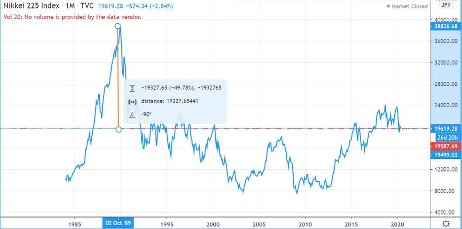 Supongamos que invertir a largo plazo para un participante significó en 1990 comprar 25% de su portafolio en la Bolsa de Japón, la más bursátil del mundo en ese entonces. El resultado de mantener una posición a largo plazo significa un rendimiento de -49.78%